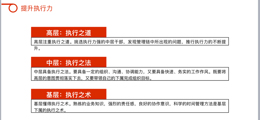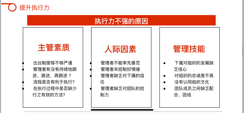 生動形象地幫助大家建立了對執(zhí)行力的結(jié)構(gòu)化認知,更進一步理解到了工作態(tài)度、工作職責、工作任務、工作結(jié)果的邏輯聯(lián)系,以及如何在強化執(zhí)行力的同時,提高部門運作效率,使效能與效率相輔相成,創(chuàng)造出更高的部門績效。